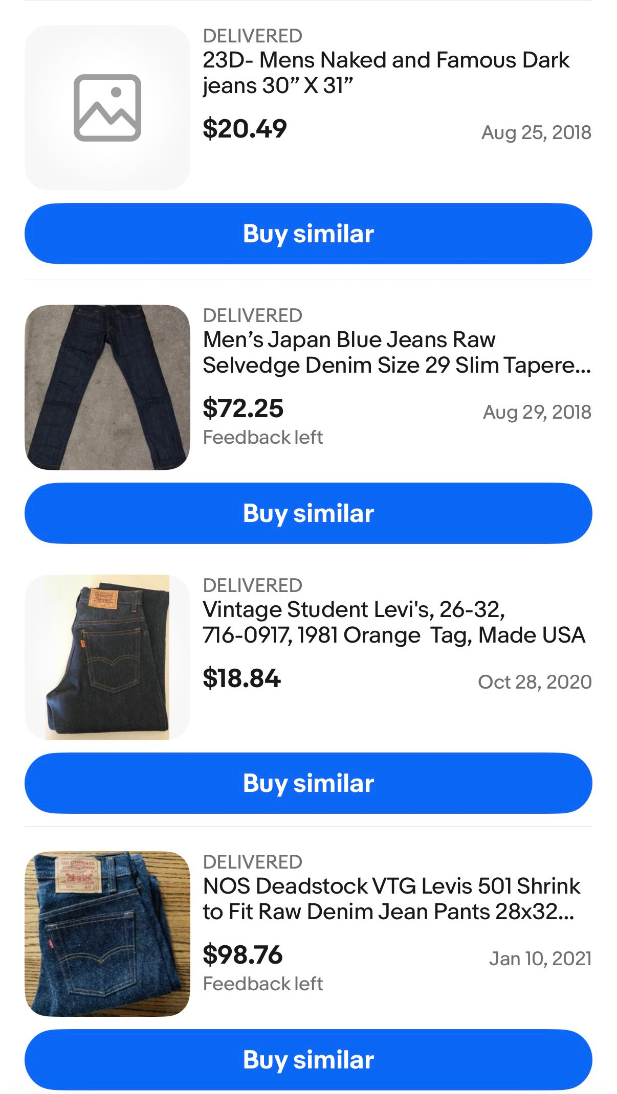 All the jeans I’ve bought from eBay. The 501 Shrink to Fit are probably the only pair I’d consider good in this lineup